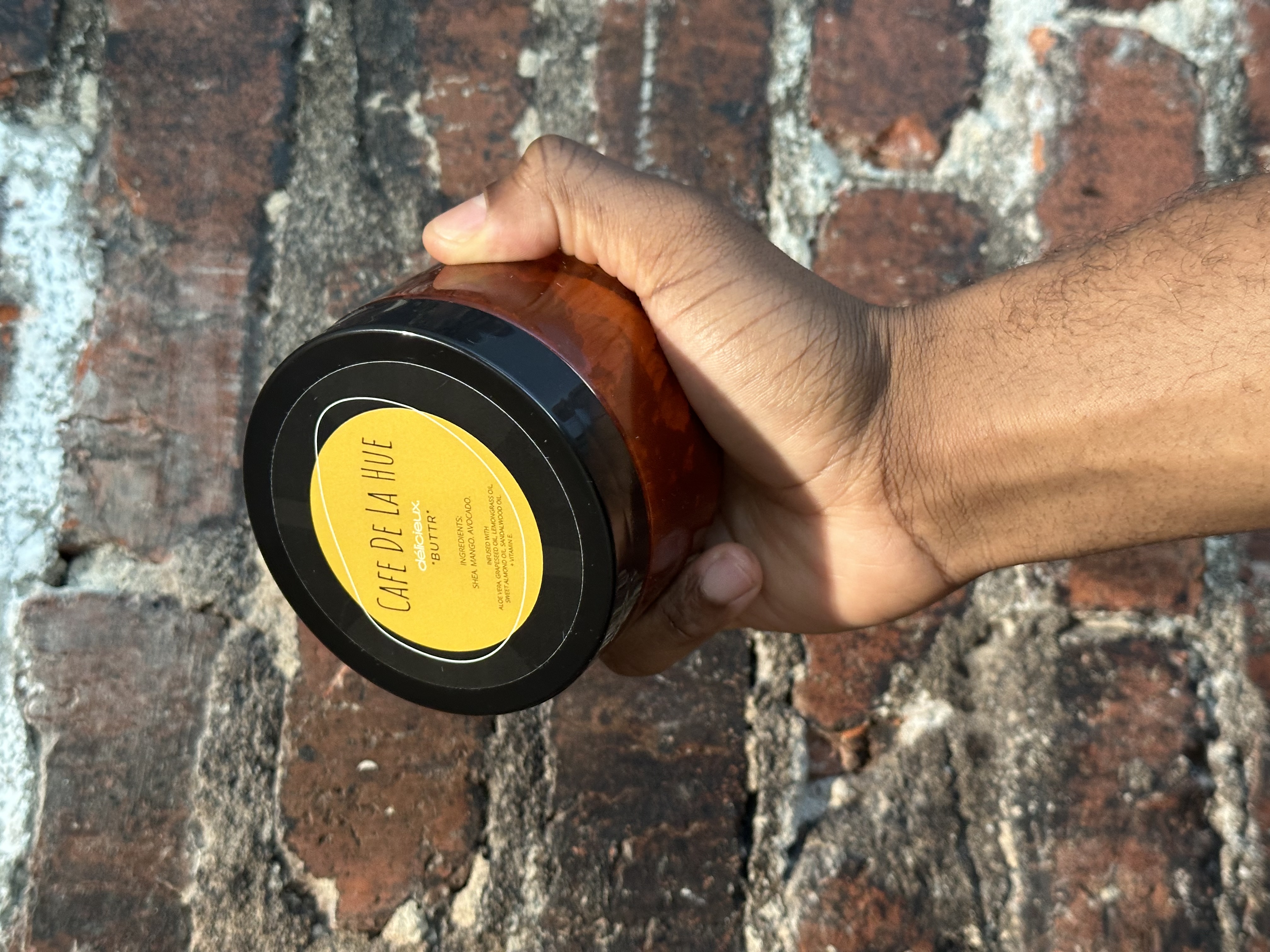 Cafe De La Hue's délicieux " BUTTR " is a whipped and creamy mixture of shea butter, mango butter, and avocado butter. Infused and enriched with aloe vera gel, grapeseed oil, lemongrass oil, sweet almond oil, sandalwood oil, + vE.